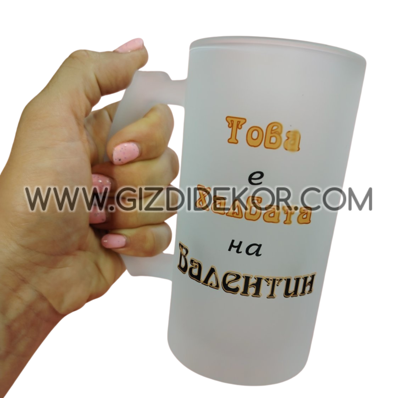 Стъклена халба за бира от матирано стъкло с отпечатан дизайн и ИмЕ, това е прави персонална, лична и единствена. Може да бъде уникален подарък, както за вас, така и за всеки ваш близък, който е любител на бирата. Вместимост 500 мл Халбата е с две лица и на двете визията е една и съща. Халбата е изработена по технологията СУБЛИМАЦИЯ и печата няма да се развали при миена многократно дори и в миялна машина.