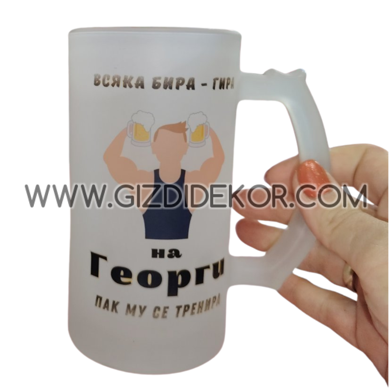 Стъклена халба за бира от матирано стъкло с отпечатан дизайн и ИмЕ, това е прави персонална, лична и единствена. Може да бъде уникален подарък, както за вас, така и за всеки ваш близък, който е любител на бирата. Вместимост 500 мл Халбата е с едо лице, изображенето е еднакво от двете страни, изглежда както е показано на снимката. Халбата е изработена по технологията СУБЛИМАЦИЯ и печата няма да се развали при миена многократно дори и в миялна машина.