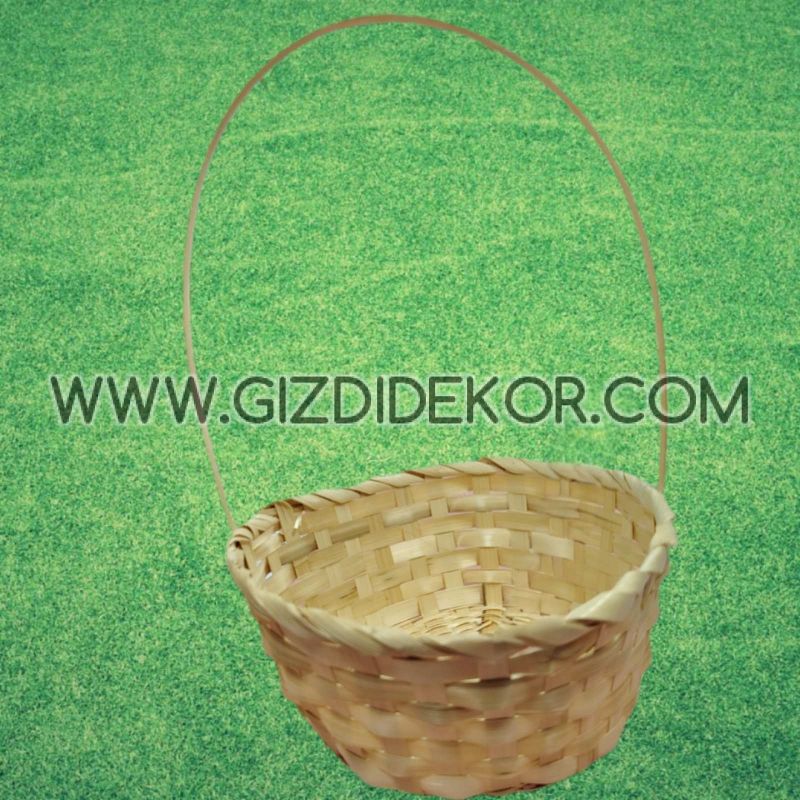 Плетена кошница от естествени материали, с висока тънка дръжка. Подходяща за подаръчни аранжировки, сладки изненади, декорации и детски празници.
