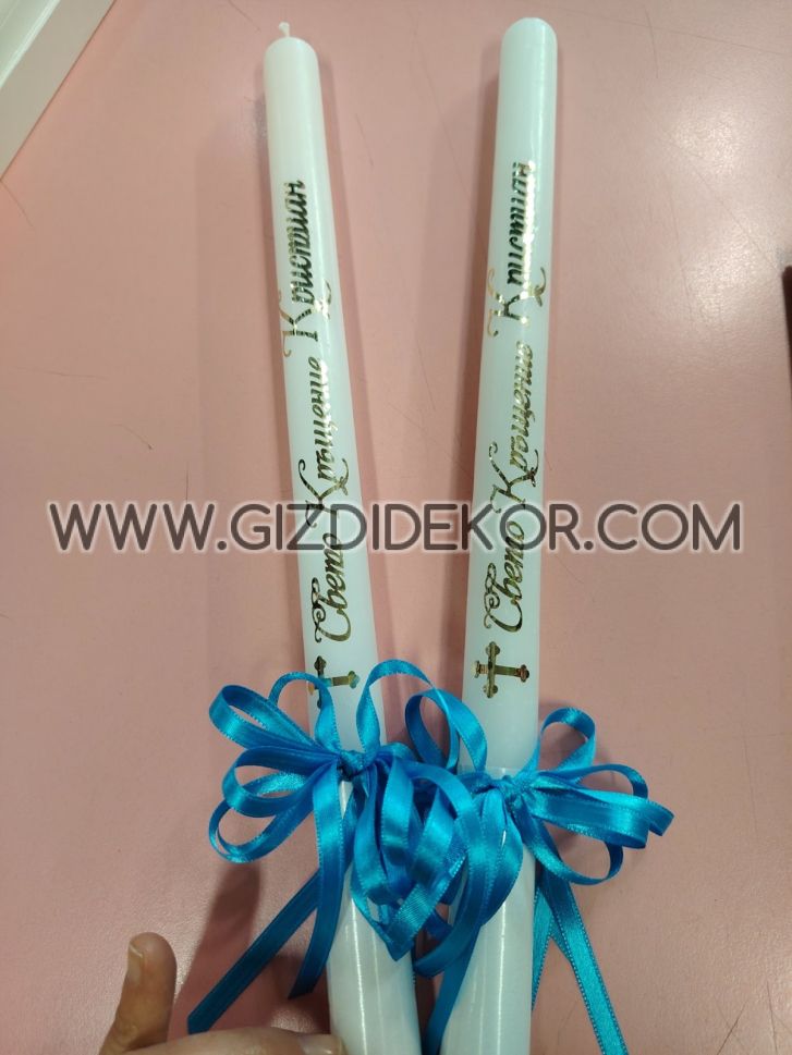 Елегантни ритуални свещи за кръщене, с нежнадекорация и персонален надпис. Красив детайл, който прави празника ви още по-специален.